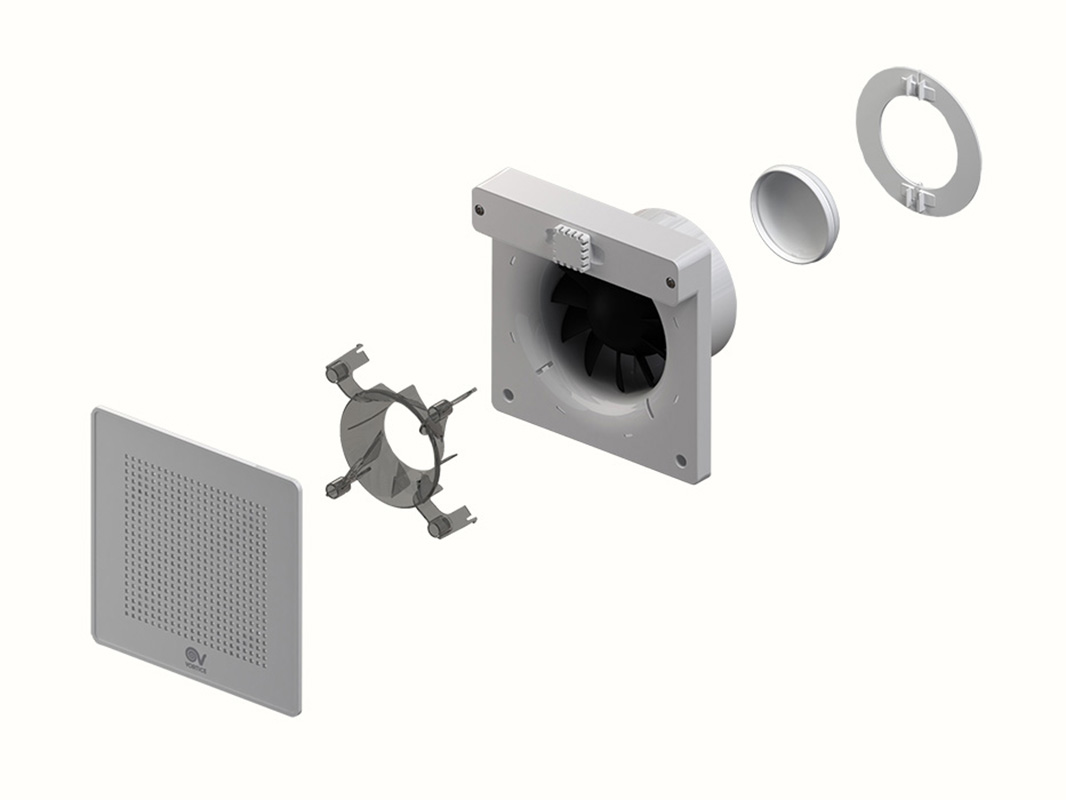• Costruzione in resina plastica bianca resistente all’invecchiamento dovuto all’esposizione al sole (“UV resistant”). • Diametro nominale 120 mm. • Motore termicamente protetto, con albero montato su supporti con cuscinetti a sfere; 2 velocità di funzionamento controllate da una scheda elettronica. • Portata compresa tra 120 m3/h e 175 m3/h. • Versione con timer semplificato ad una velocità: l’apparecchio è dotato di scheda elettronica che permette lo spegnimento ritardato. L’entità del ritardo di spegnimento, così come l’unica velocità di funzionamento, Vmin o Vmax, sono impostabili in fase di installazione. • Dotato di valvola di non ritorno per evitare il rientro non voluto di aria quando spento.